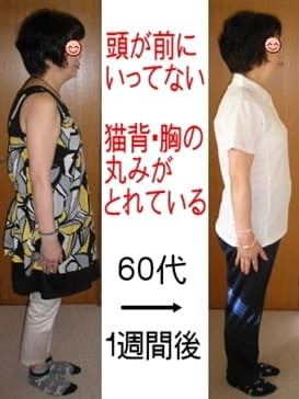 この40代の方は、猫背・肩こり解消で施術を行ったのですが、上の写真のように2週間後には、ついでにお腹がへこみ、足も細くなられています。