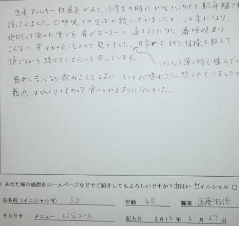 口呼吸での生活が続いていましたが、この年になり施術して頂いた後から鼻がスースーに通るようになり、鼻呼吸はこんなに楽なものだったのかと驚きました。